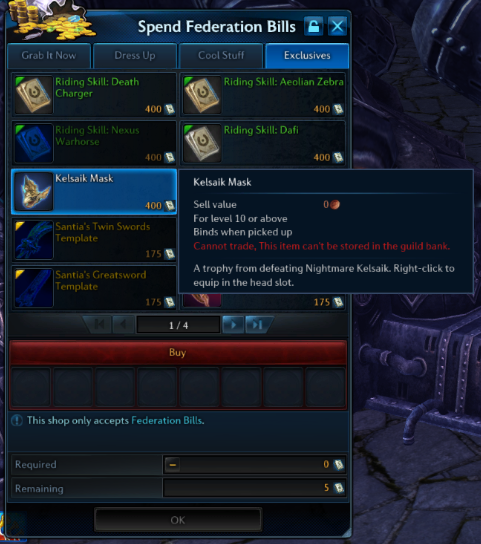 One of the bigger conflicts arising from EME’s implementation of the Federation Bill Store is adding in the Kelsaik Mask cosmetic. Previously, this was the reward for completing KNHM a staggering 30 times for the “A Wrong of Fire and Ice” achievement. By adding it into the Store and making it attainable by waiting 80 days, many players who ground through the dungeon will suddenly find their special cosmetic not-so-special. In the end though, at least the Title is still locked to achievement, so there is still that to be content with.