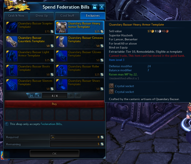 As mentioned before, both the Santia and Quandry Bazaar templates, formerly costing Fraywind credits before being removed, are now available. Where the Santia template could be replicated by crafting the dyeable, template-able Dreamkeeper set, that route would take farming for Dream Bindings and Godsmarrow to craft. Quandry Bazaar, on the other hand, is a template for the Abyss set of gear, so their return as a template is a welcome sight.