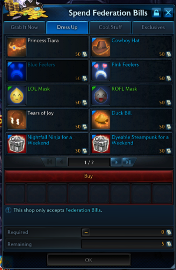 Second page now. Standard fare again. Looks like they just brought back everything that Major Milestone used to sell, except they’re using Federation Bills as currency rather than those tokens they gave out at the time. Whatever. These are pretty cheap cosmetics; nothing is particularly fancy or a must-get.