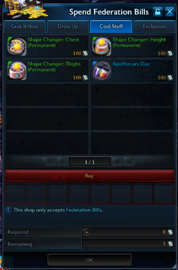 First tab of the Federation Bill Store. Hardly impressive. Temporary Shape Changers are fun to joke around with, and one-use Atlases are pretty cheap (more on Bills later)